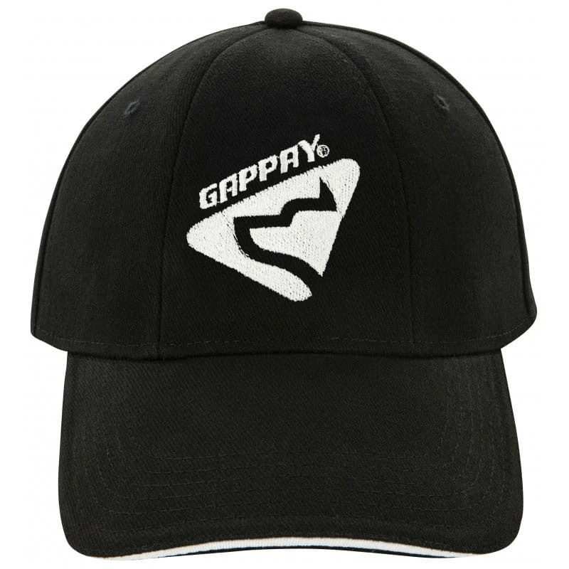 Czapka z daszkiem czarna z białym logo firmy Gappay i białą lamówką.