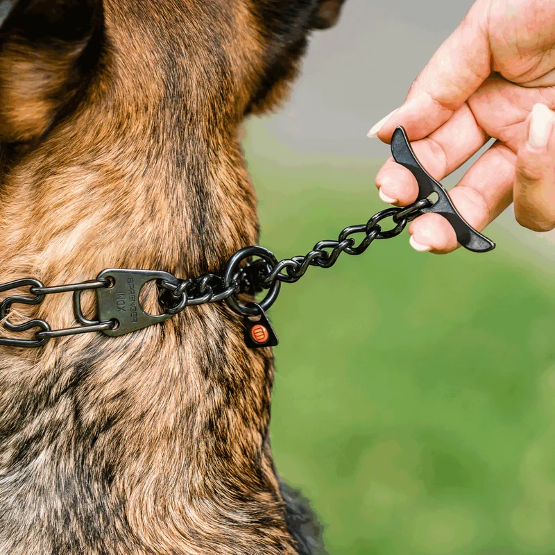 Nowe zapięcie w kształcie ogona wieloryba pozwala prowadzić psa bezpośrednio za obrożę, bez konieczności dotykania łańcucha (alternatywa dla krótkiej smyczy)