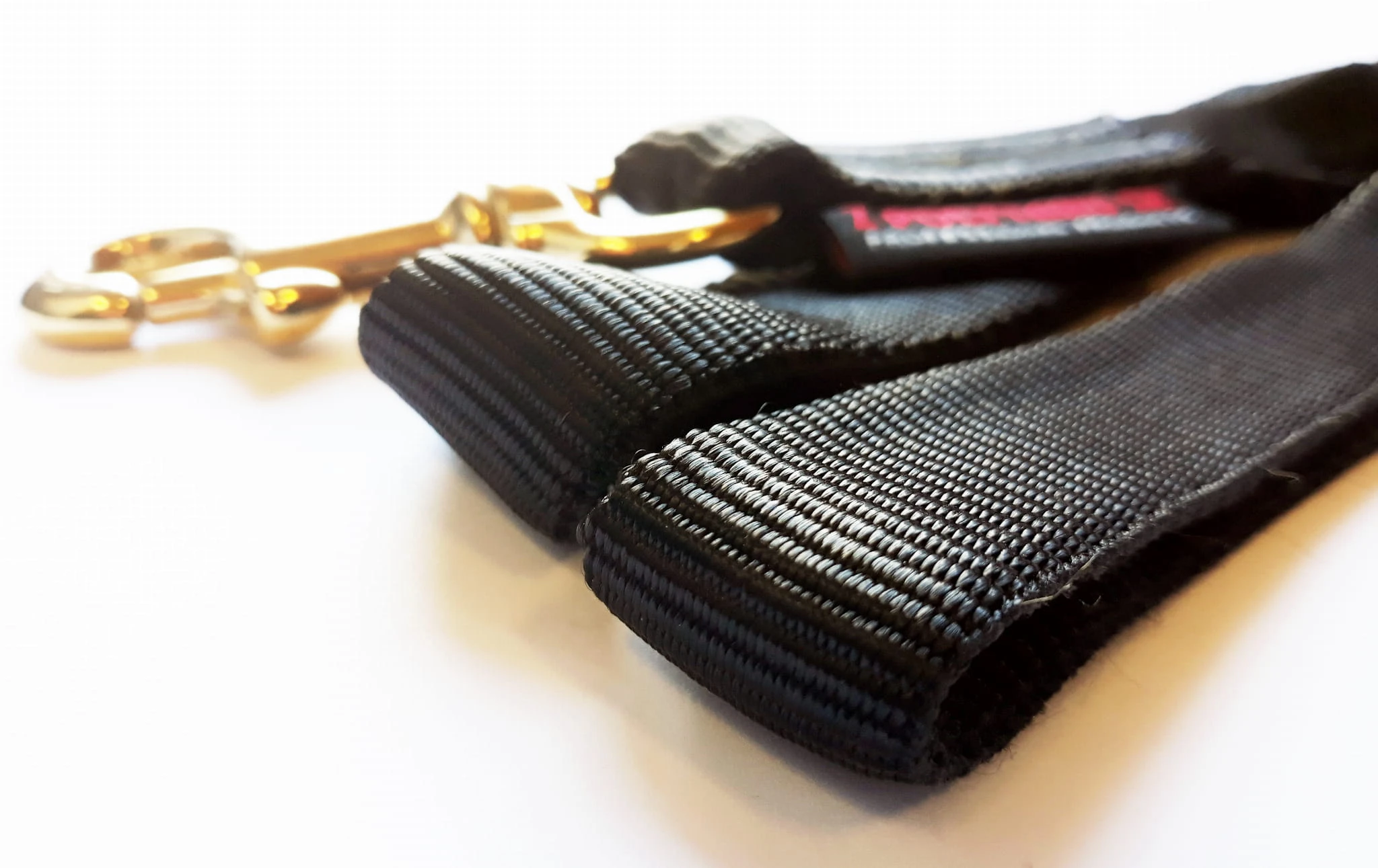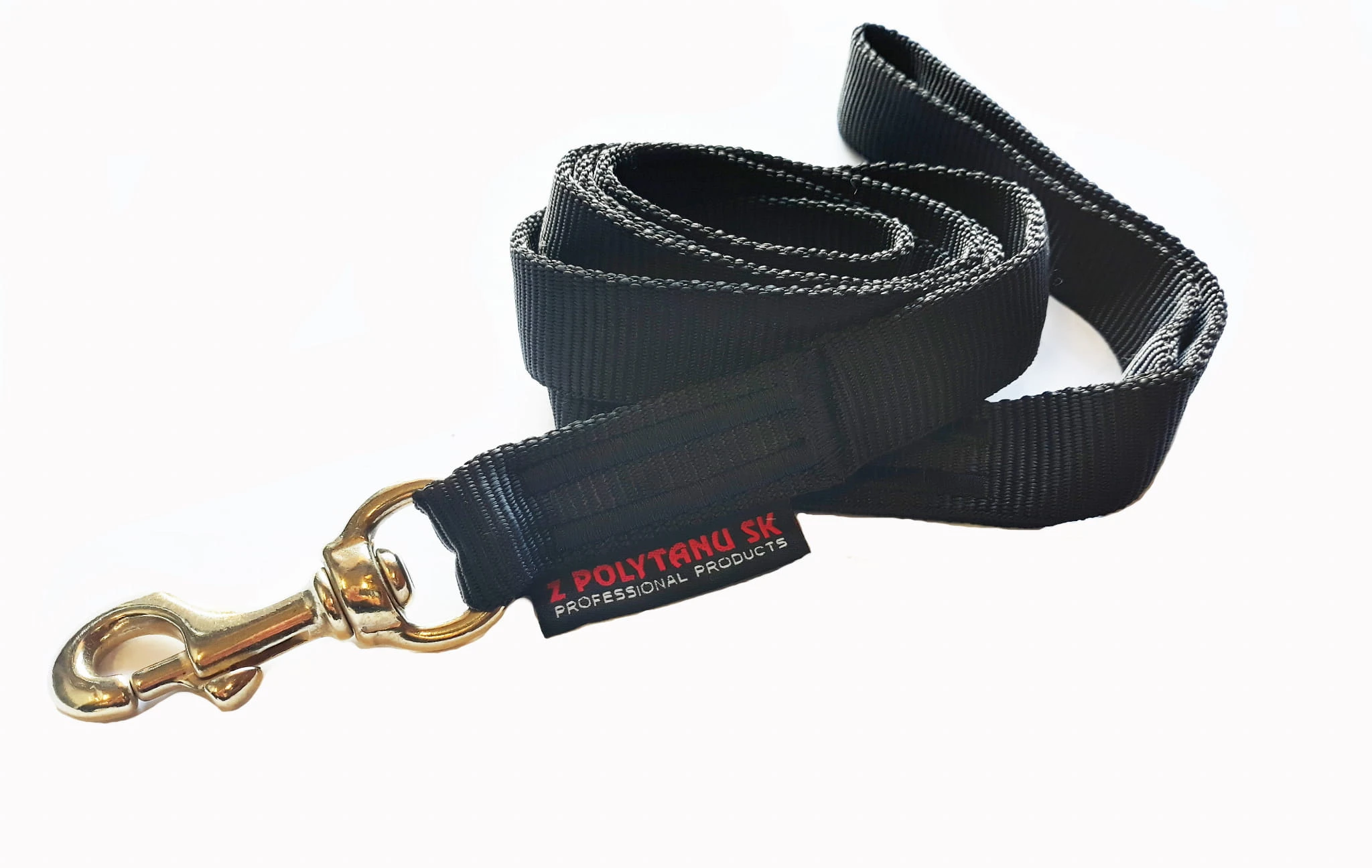 Poliestrowa smycz w kolorze czarnym, z rączką i mosiężnym karabińczykiem.